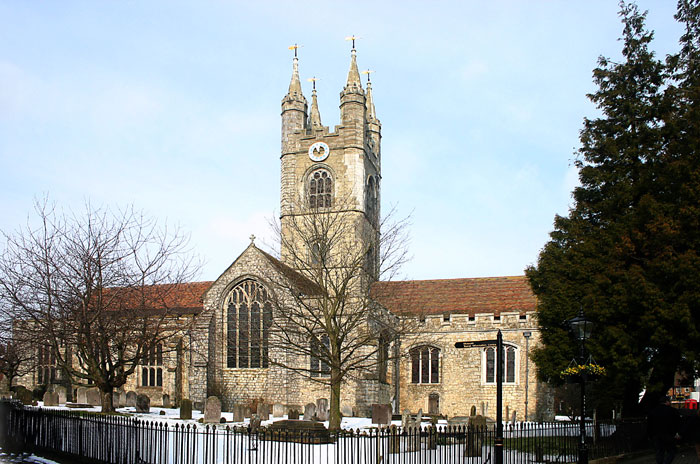 This photograph was taken from the south side in March 2004. The church is a cruciform layout, with a central tower which dominates the old town skyline. St Mary's is situated in its own churchyard, surrounded in a pedestrian walkway by historic buildings, some of which remain private houses, others converted to shops and offices. The College, to the southeast, is the vicarage. To the west is the old grammar school. The layout is conventional for a cruciform church. The central axis comprises from west to east, a nave, central crossing, then chancel. To the north and south of the chancel are chapels, respectively the St Nicholas Chapel, and the St Anne's Chapel. To the north and south of the crossing are transepts, the southerly of which has been known in the past as the Smythe Chapel or the Strangford Chapel. The north transept now provides room for the pipe organ, as well as an entrance into the church from that part of the churchyard adjacent to the town centre. The nave has aisles north and south, and a gallery added in the 17th and 18th centuries. The west end of the nave is partitioned to provide a meeting room. The superb Perpendicular period tower was built as part of the major restoration by Sir John Fogge, and encompasses an earlier Decorated period structure. It is supported by four piers, above which are weathervaned pinnacles sitting within castellated turrets. Within the tower are hung ten bells, the tenor weighing over 22 cwt. In addition, there is a carillon. The present visible structure comprises the restored building following Sir John Fogge's enterprise in 1479-90 (Burden, B revised 1996) or 1475-83 (Newman, J 1969 et al), and an essentially Victorian remodelling west of the crossing. |